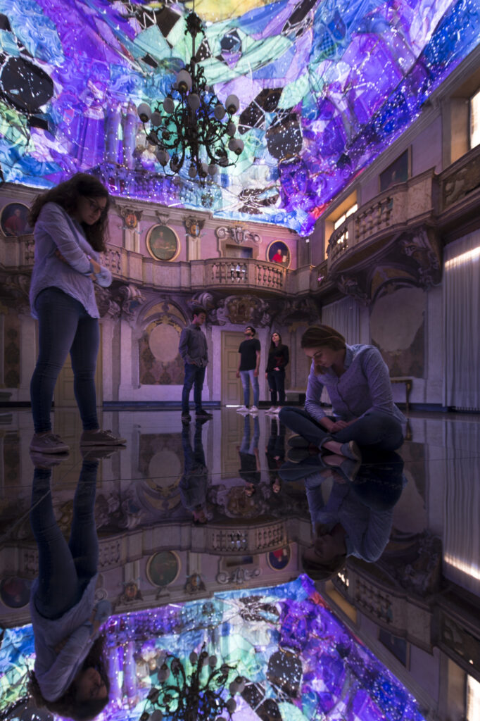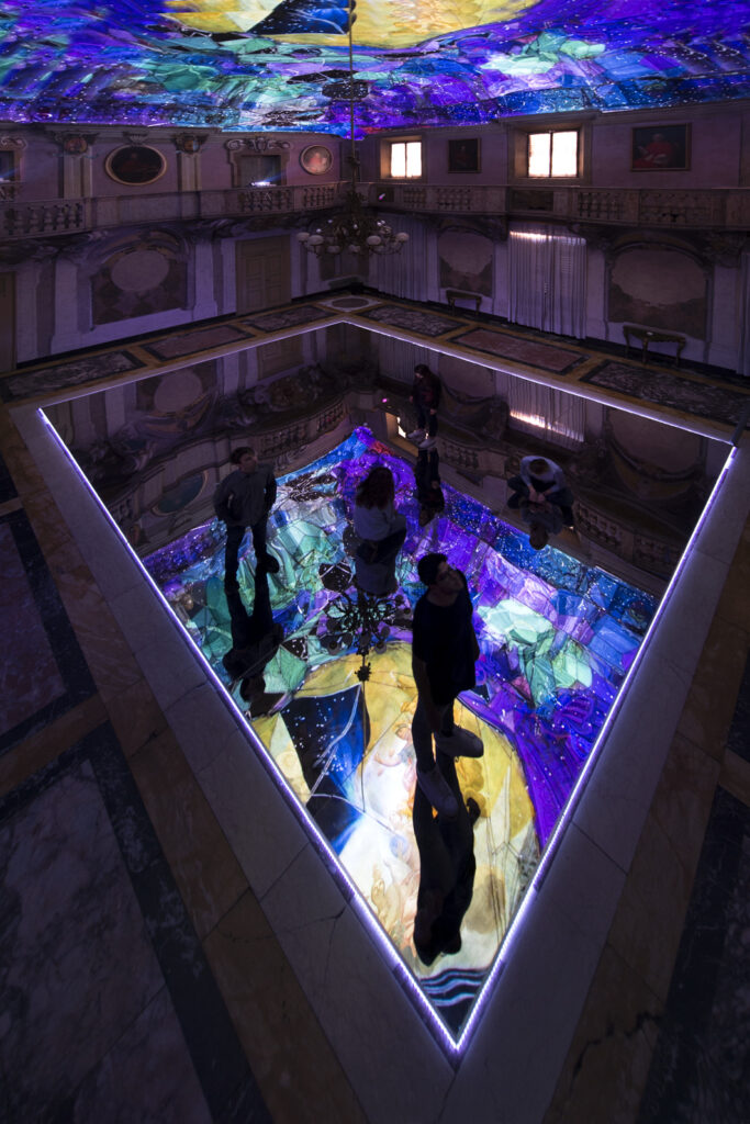 Utilizzando la tecnica del mapping procedurale, l’installazione sviluppa una sequenza di animazioni a partire da un’elaborazione dell’affresco della volta della sala, da cui discendono frequenze sonore che si legano in chiave sinestesica al movimento, al colore e alla dimensione dei contenuti grafici generati.