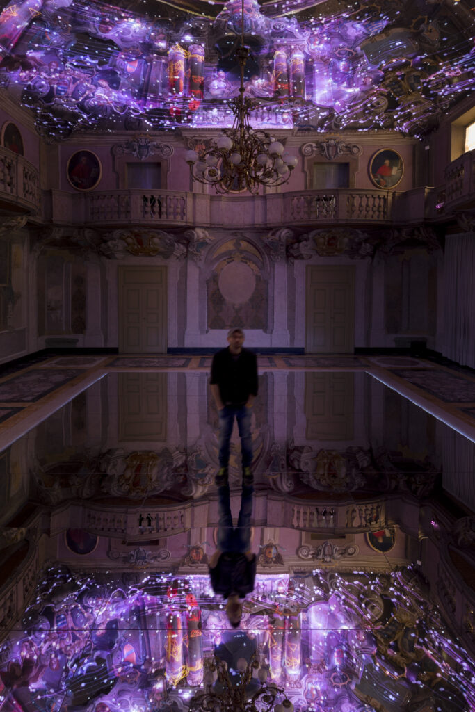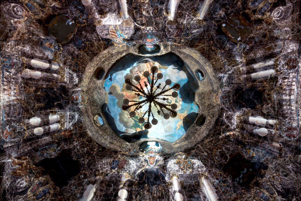 L’opera è un’installazione dove lo spettatore si immerge in una dimensione sinestetica grazie a strumenti tecnologici che elaborano informaticamente la decorazione della volta seicentesca della Sala dei Cardinali della Fondazione San Carlo di Modena.